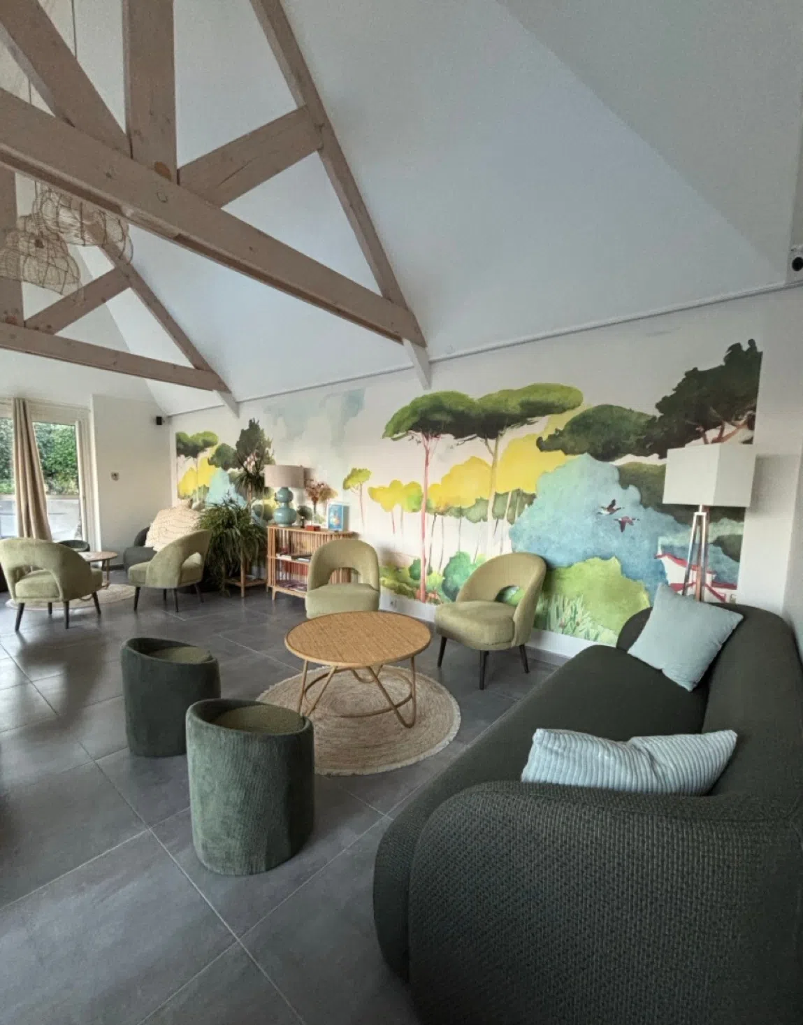 Le parti pris repose sur un dialogue subtil entre matières et couleurs, inspirée par les paysages environnants, afin d’installer une atmosphère chaleureuse, intemporelle et harmonieuse, favorisant le confort, la convivialité et l’envie de prolonger l’expérience sur place.