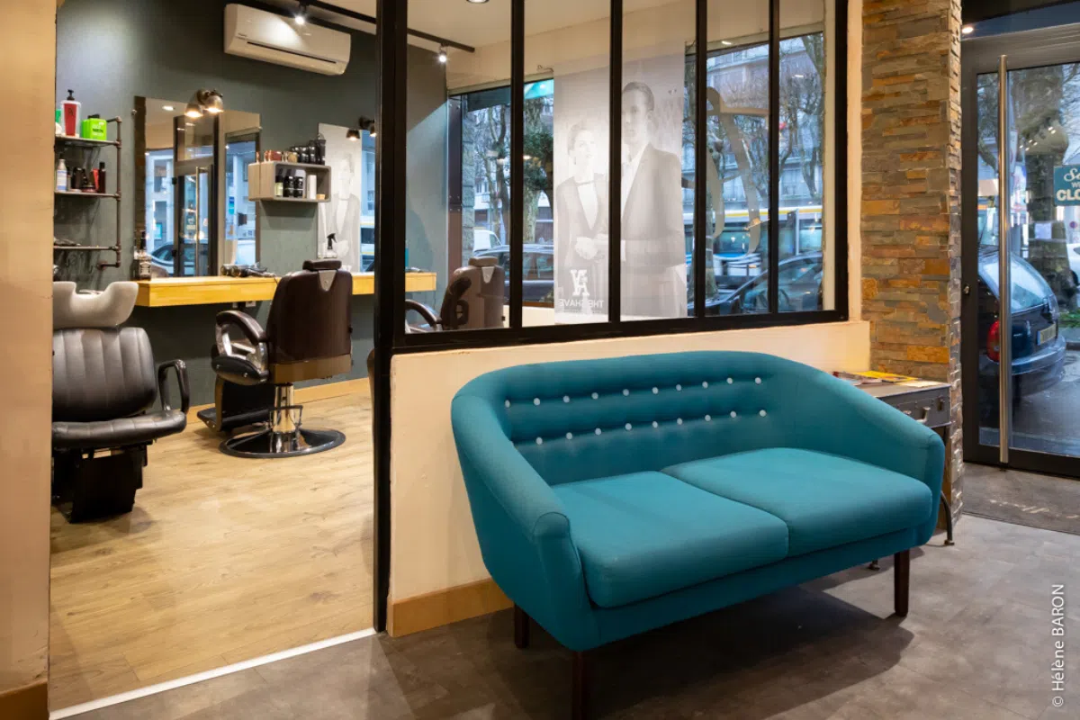 • Un univers masculin affirmé, valorisé par un fauteuil barbier et une ambiance résolument plus brute et masculine dans le style et les matériaux.