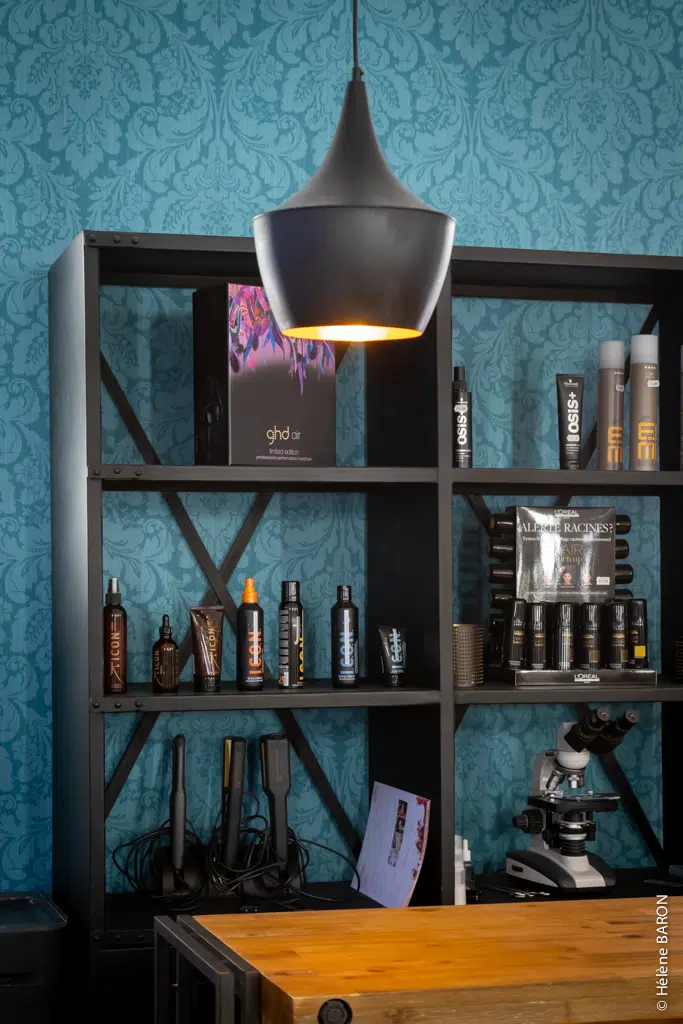 • Un univers masculin affirmé, valorisé par un fauteuil barbier et une ambiance résolument plus brute et masculine dans le style et les matériaux.